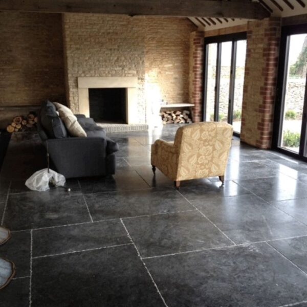 Belgian fossil limestone, most famously known as Petit Granit or Belgian Blue Stone, is a dense, crinoidal limestone dating back approximately 350 million years to the Early Carboniferous period.The stone typically presents a distinctive blue-grey to charcoal hue. When polished, it can transform into a deep, shiny black, while weathering in outdoor environments eventually produces a soft, light-grey patina. Its most striking feature is the profusion of visible fossilized remains, primarily crinoids (sea lilies), alongside corals, shells, and brachiopods. These fossils often appear as white or light-grey markings against the darker background, occasionally accompanied by white calcite veins.