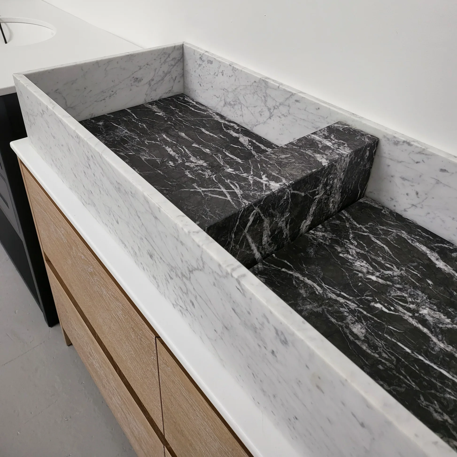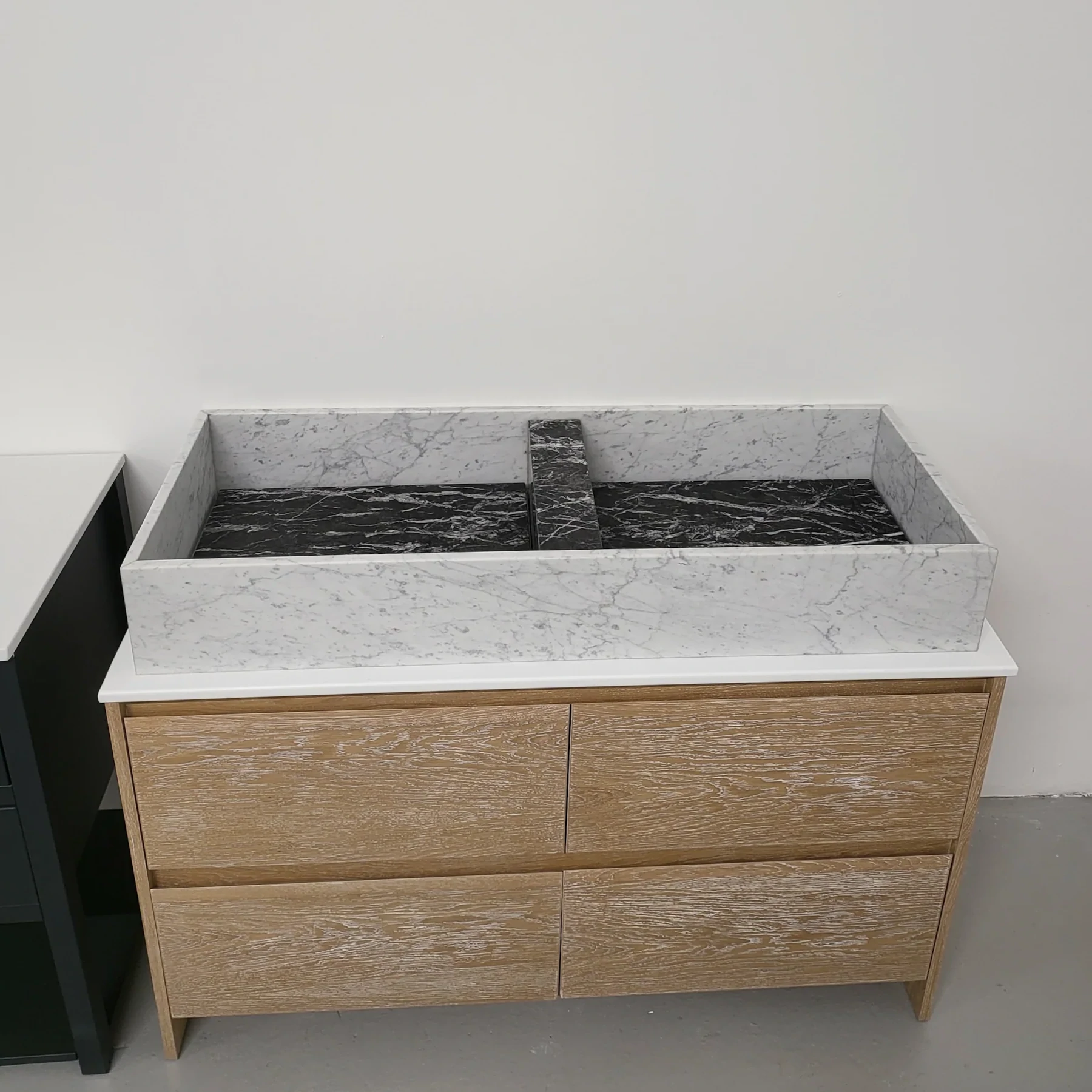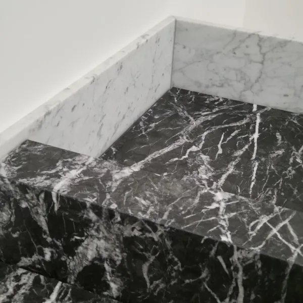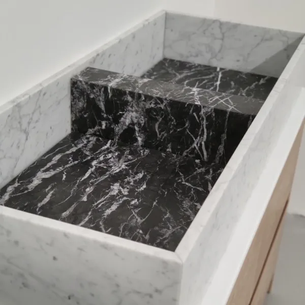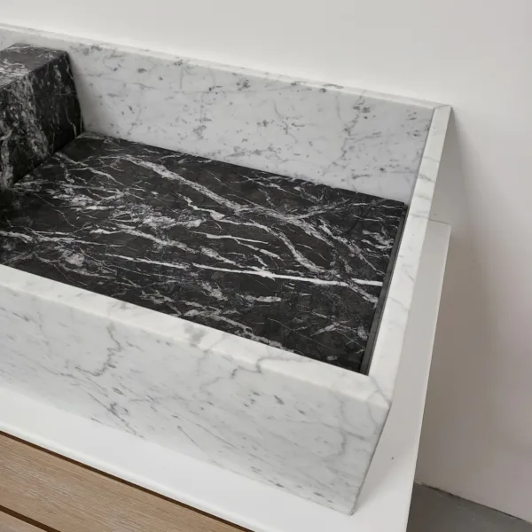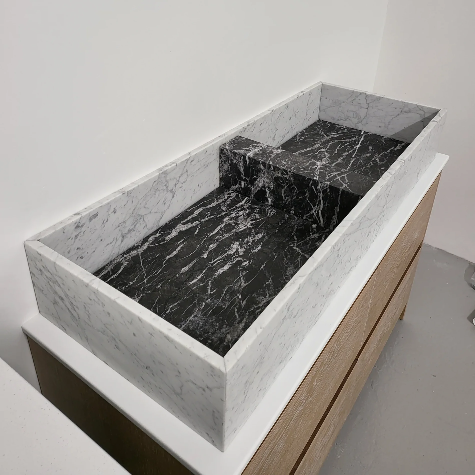 Hand made Trough style butler sink fabricated from 20mm honed Carrara white marble & Nero Marquina marble honed finish, machined base to falls (no sitting water) hole in bases for standard wastes, hidden by removable slabs to base to give a floating base appearance and a 10mm gap all round. 20mm thick stone sides. Central fixed divider. 1210 x 460 x 180mm high. central divider 93mm wide. Sealed. FREE Chrome wastes supplied.