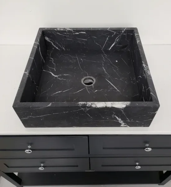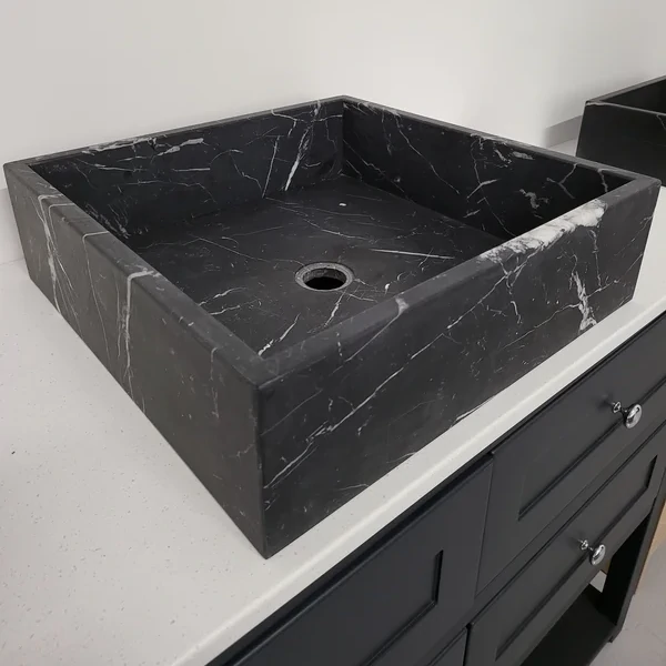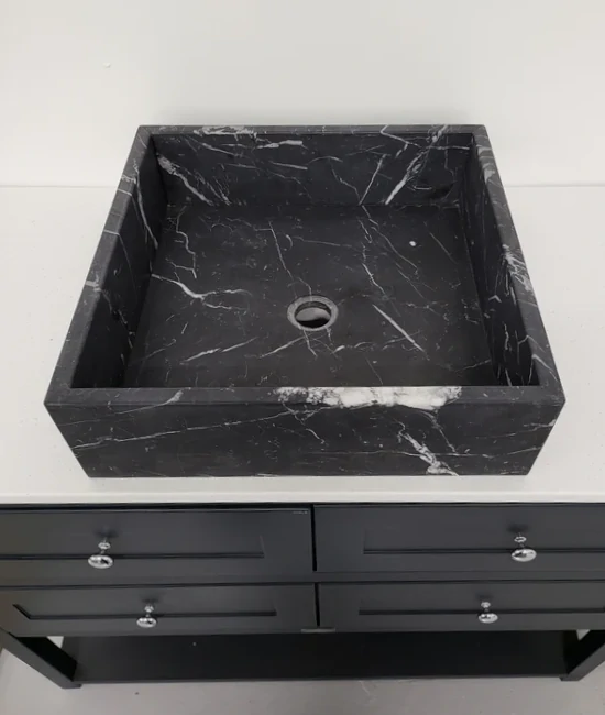 Handmade from 20 mm honed Nero Marquina marble, with a machined base to ensure drainage and 20 mm stone sides. Each basin is sealed and supplied with a free chrome revolving waste. Natural veining will differ from piece to piece, giving every basin its own character.