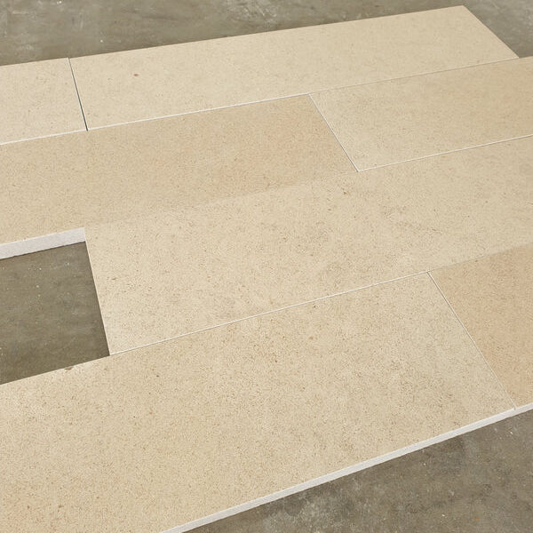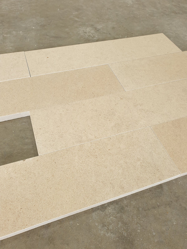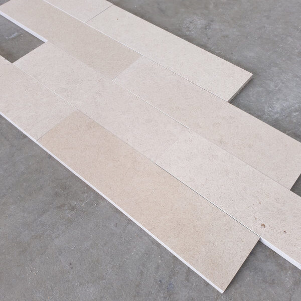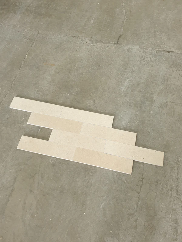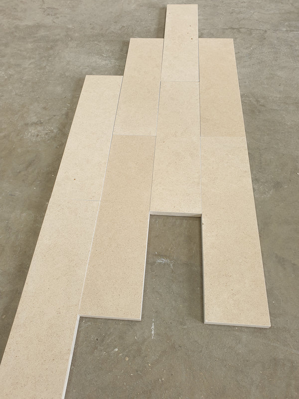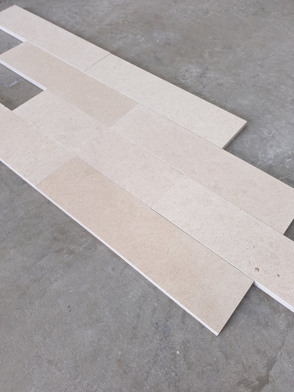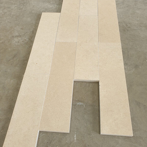 Portuguese limestone in a slim, elongated format, well-suited for bathrooms or wall cladding. Laid in a brick pattern, the proportions create rhythm and balance. The honed finish brings out the stone’s speckled character with quiet restraint.