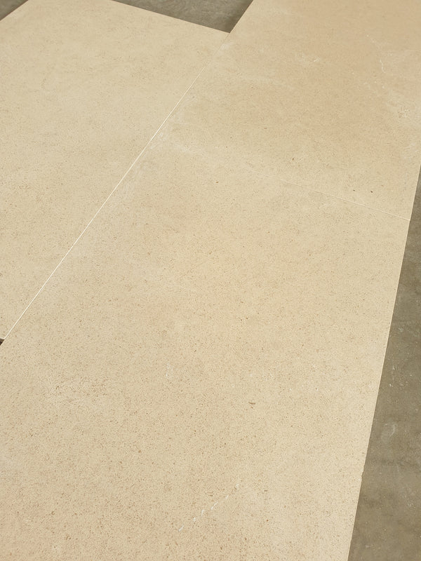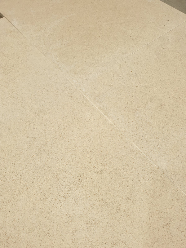 A Portuguese limestone in a generous large format, ideal for entrance halls, bathrooms, or continuous floor and wall surfaces. The honed finish reveals a fine speckled character, understated yet enduring. Each tile measures 900 × 500 × 20 mm, offering clean proportion and presence in scale.