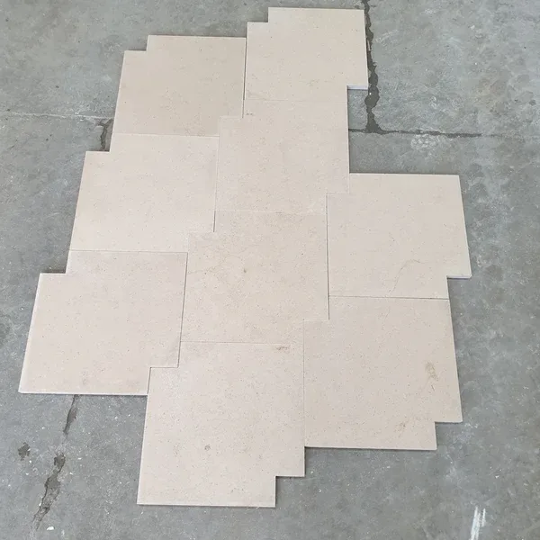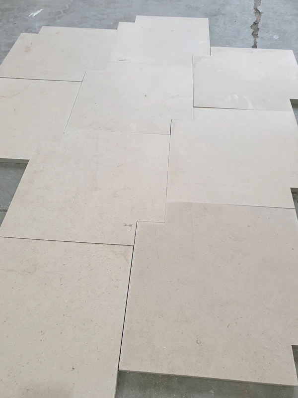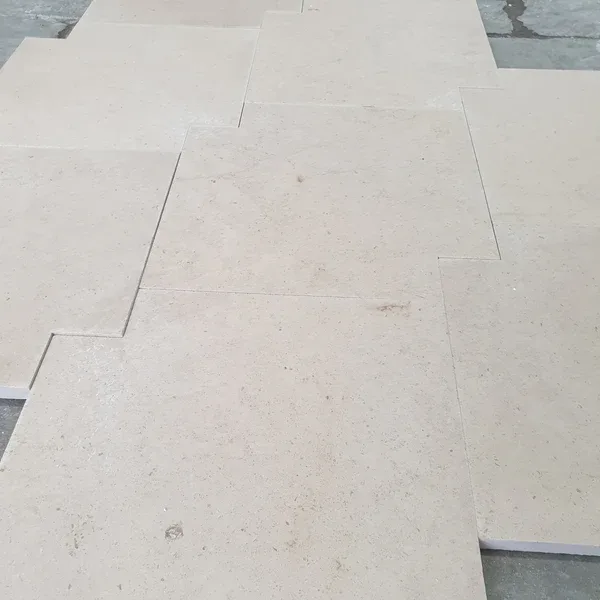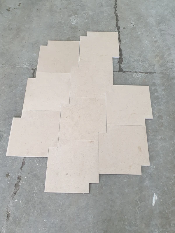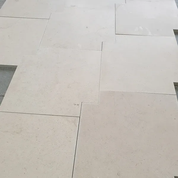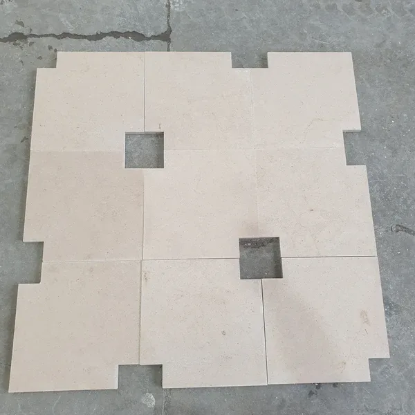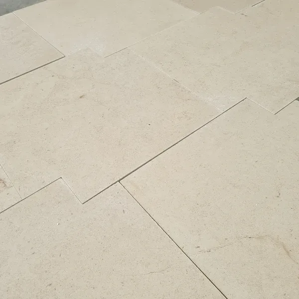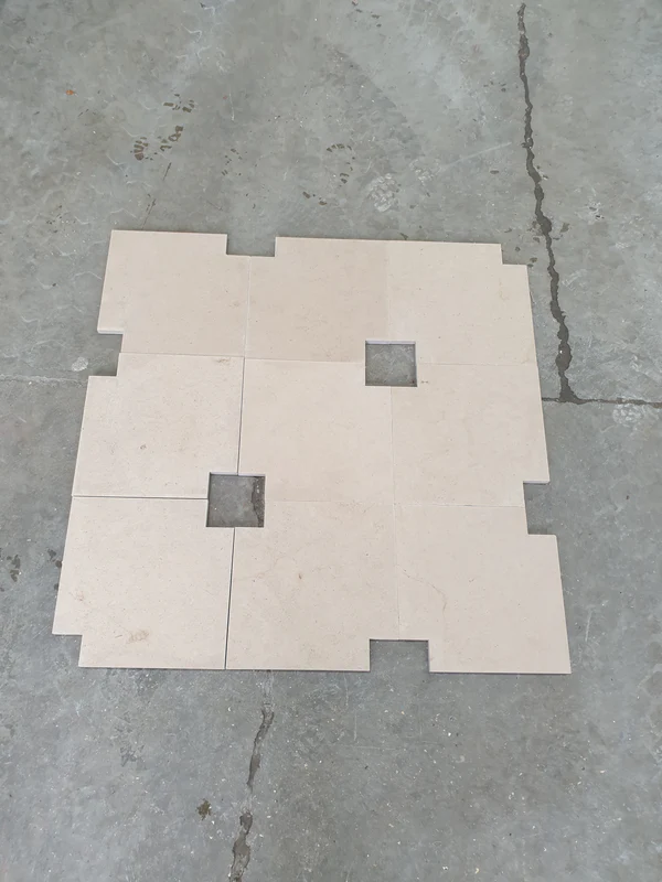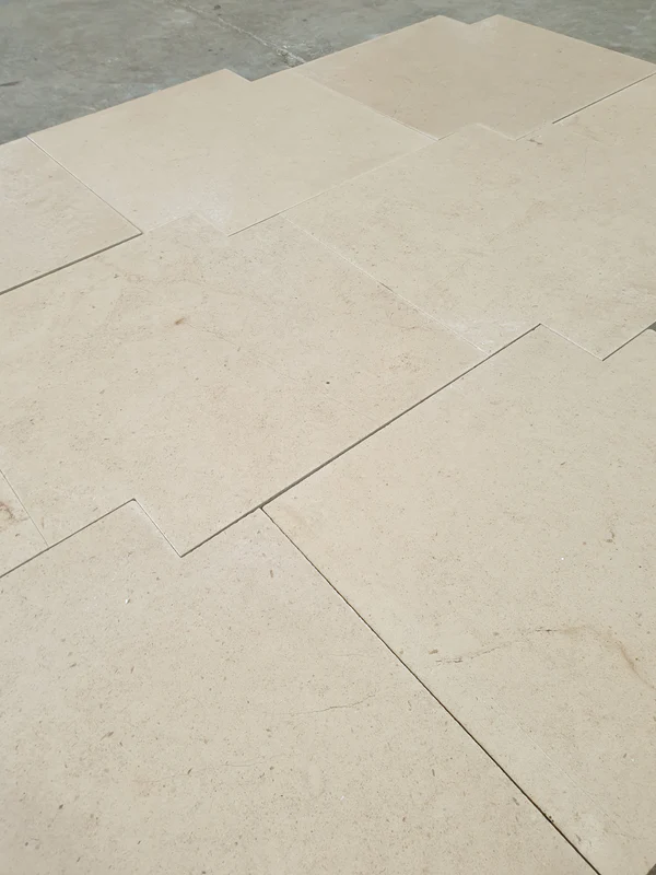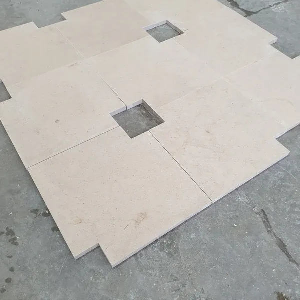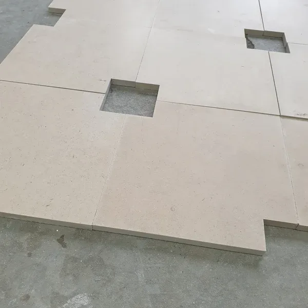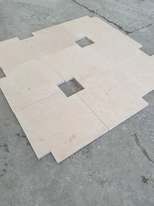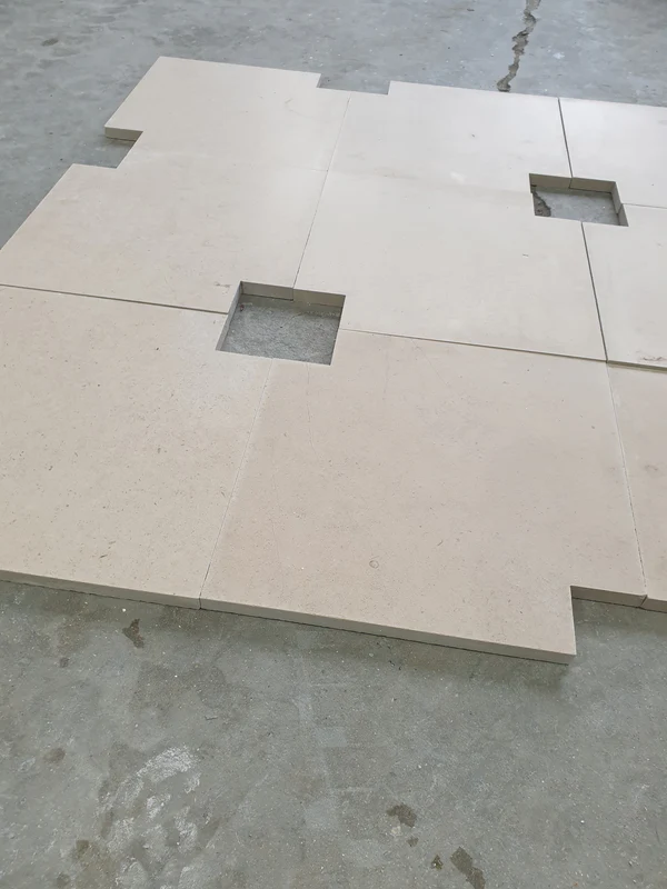 Crafted from Portuguese limestone, these tiles are hard-wearing and well-suited to entrance halls and high-traffic spaces. Each 400 × 400 × 20 mm tile is cut with two 70 × 70 mm corner recesses, designed to take cabochons if desired (available separately), or to be laid in an interlocking pattern. The honed finish brings a smooth surface that reveals the natural character of the stone.